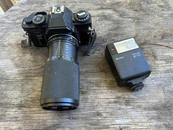 Older model KR-10 Ricoh 35 mm camera body, well used but still in good working condition. 75-200 mm Vivitar Macro Zoom lens, condition unknown. Ricoh Superlite 200 flash attachment. All were together when put in storage 10 years ago. Selling now, $ 25.00 for all.